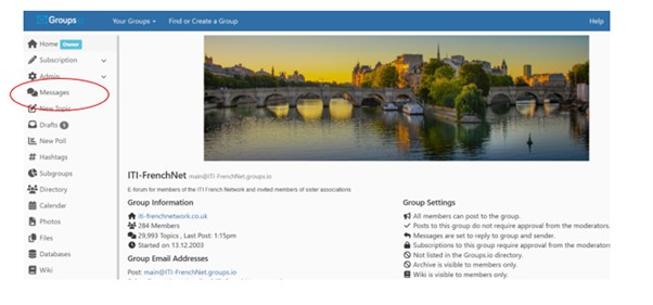 To view existing messages, go to the e-forum platform at https://iti-frenchnet.groups.io/g/main and on the left-hand side, select “Messages”: