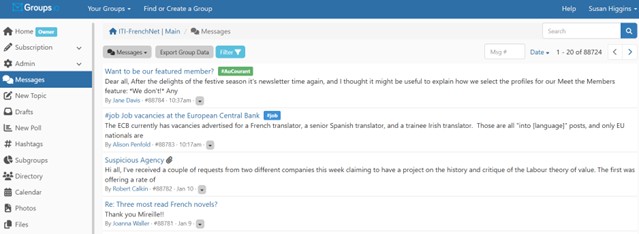 If you click on “Hashtags”… well, that’s a whole other kettle of fish! We’re in the process of tidying up the hashtags to try to make them more meaningful. If you know a bit about #hashtagmanagement, I’d love to hear from you. Please get in touch by emailing membership@iti-frenchnetwork.co.uk. Then, hopefully, hashtags will feature a future episode of Getting to Grips with Groups.io.